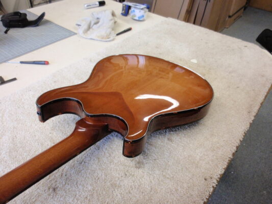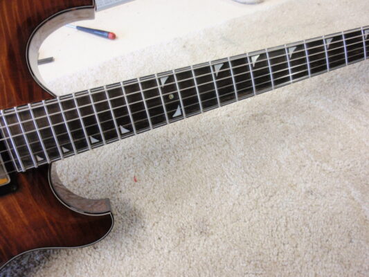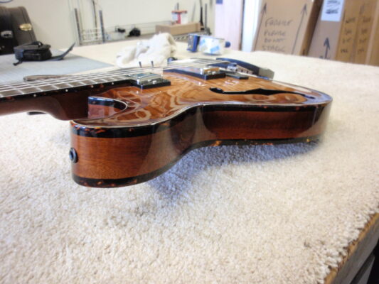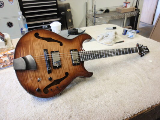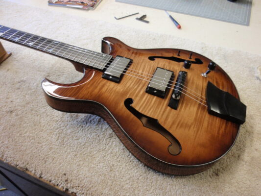 Flamed Maple Top Hollowbody Details Hollow STD Headstock Flamed Maple Top Traditional F-Hole Tortoise Binding Rosewood Burst Finish Semi-Hollowbody Burled Elder #361 Hollowbody #141